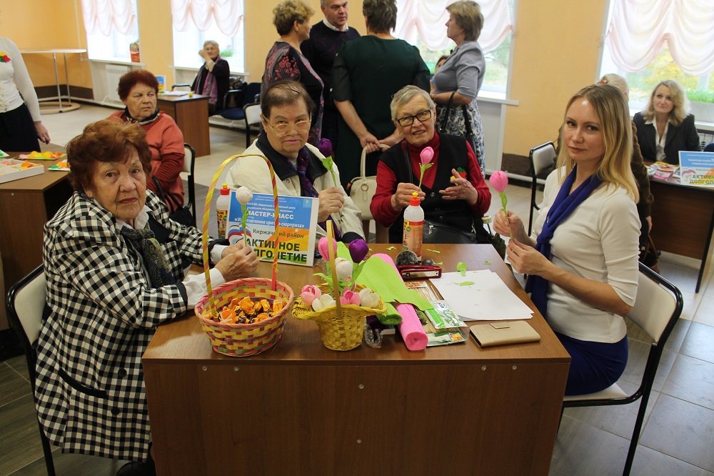 Доброй традицией стало отмечать День уважения старшего поколения. В районном доме культуры г.Киржача 4 октября прошла акция встреча «Вместе к активному долголетию». Для наших мудрых и «очень взрослых» жителей это не только праздник, но и еще одна возможность отдохнуть и пообщаться друг с другом. Перед концертом люди старшего возраста могли получить консультации юриста, психолога, специалистов собеса и комплексного центра: узнать об возможности оказания помощи и поддержки. А также о реализации региональных проектов направленные на создание условий активного долголетия. Особый интерес участники праздничного мероприятия проявили к представленным мастер-классам по изготовлению праздничных конвертов и конфетного букета, а также мастер-класс клуба «Здоровье».